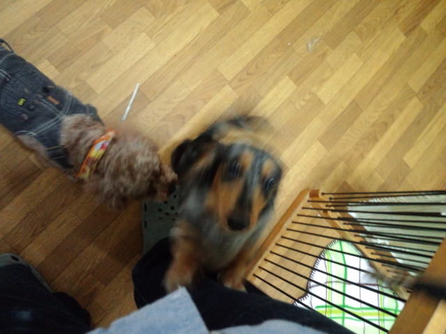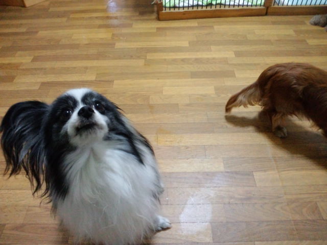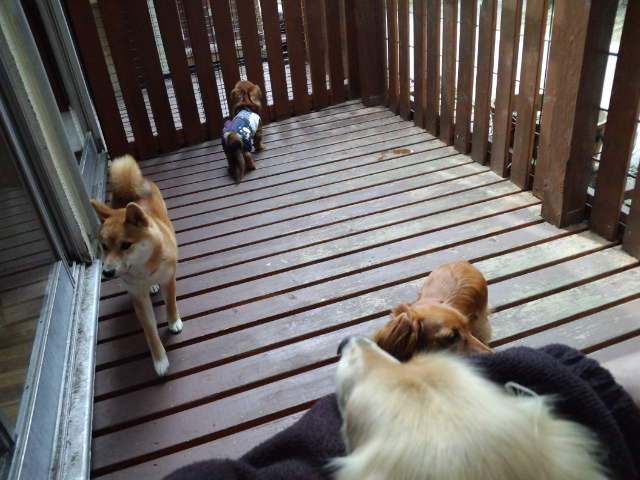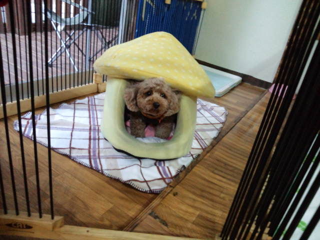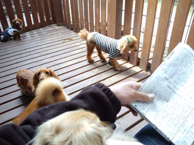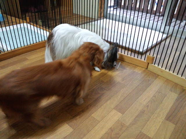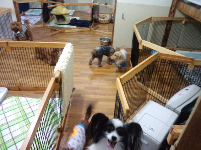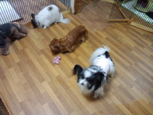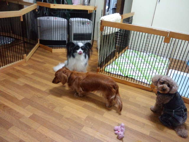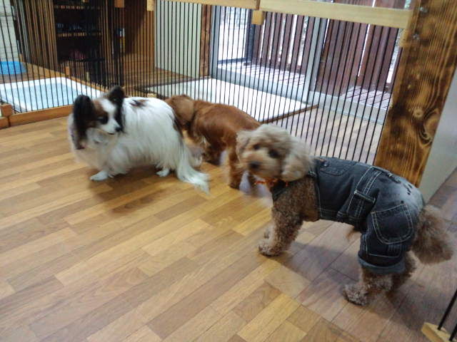 パピヨンのぷりんちゃん、みんなと一緒にいます。 トイプーのムク君もハウスから出てきました。