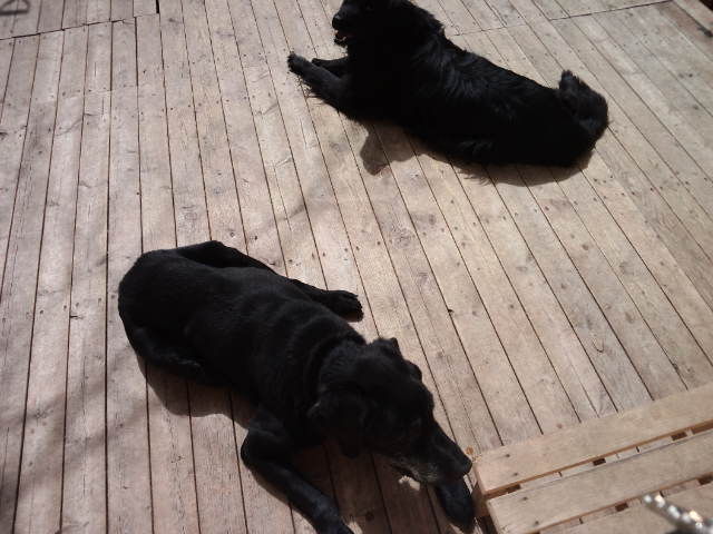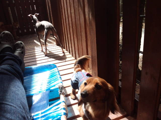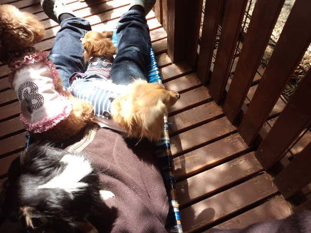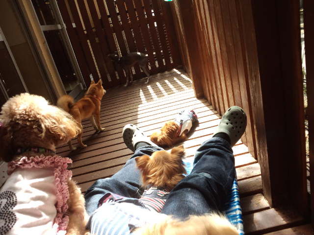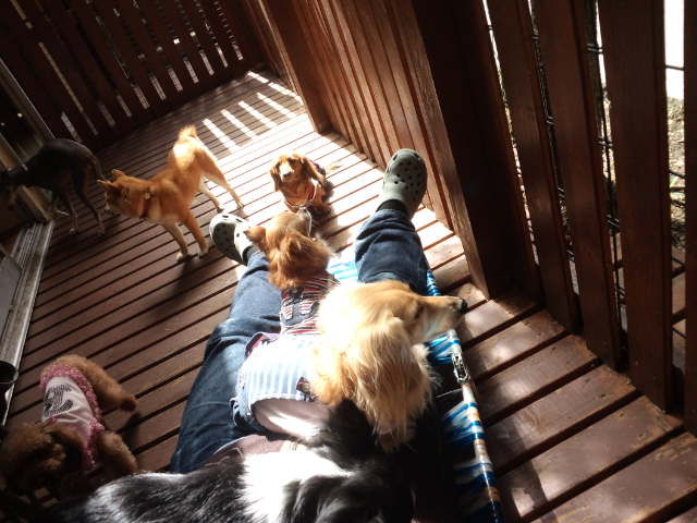 みんな飼い主さんと遊びに出かけましたが、午前中はデッキで昼寝してました。
