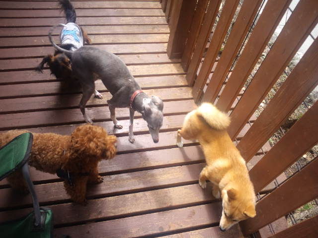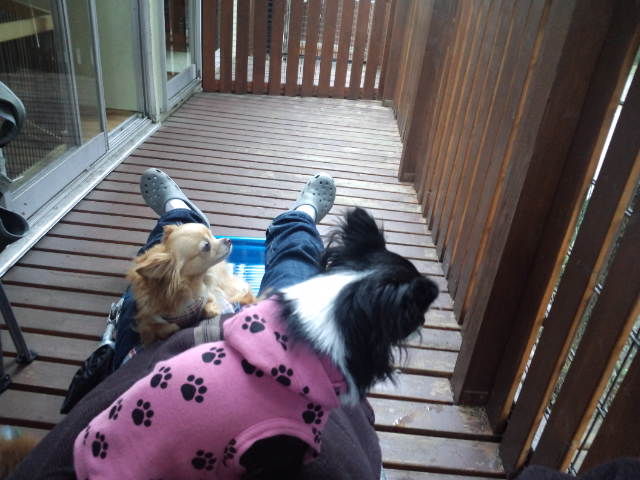 雨が降るのか降らないのか、ハッキリしない天気の軽井沢。時折、日差しも差すので、ご飯の後はみんなでデッキに出てます。