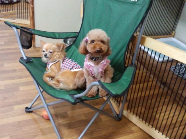チワワのリロちゃんも少しずつ他のワンコに慣れてきました。トイプーのモコちゃんと仲良く椅子で寝ています。