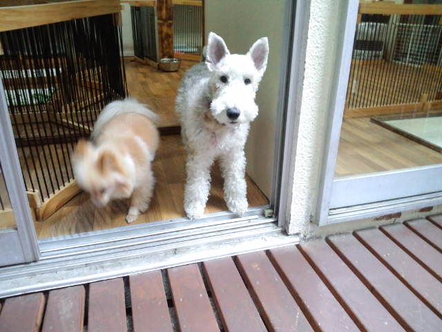 ワイヤーのロビン君とポメラニアンのポポちゃん、そんな金太郎君を眺めてます。
