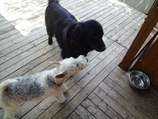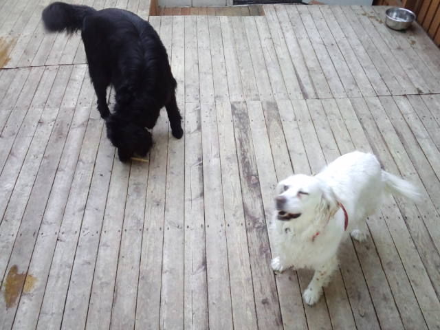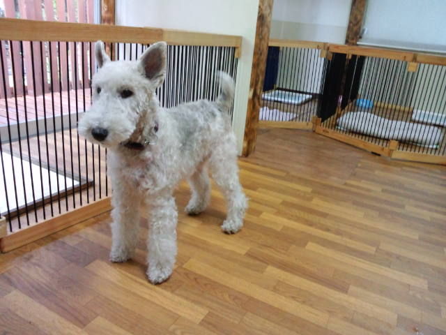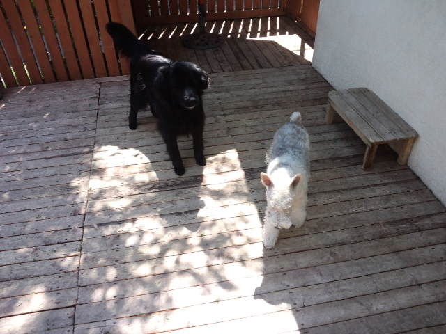 雨もあがりデッキも乾いたので、ワイヤーのロビン君は大型犬エリアにいます。