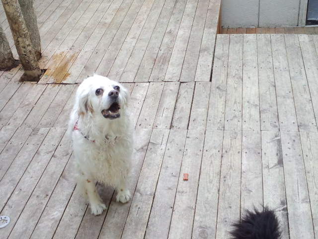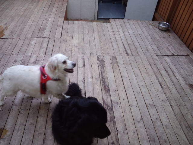 いつもは大型犬エリアで遊ぶのですが、今日はまだデッキが雨で濡れてます。デッキが乾いたら大治郎と遊びな。