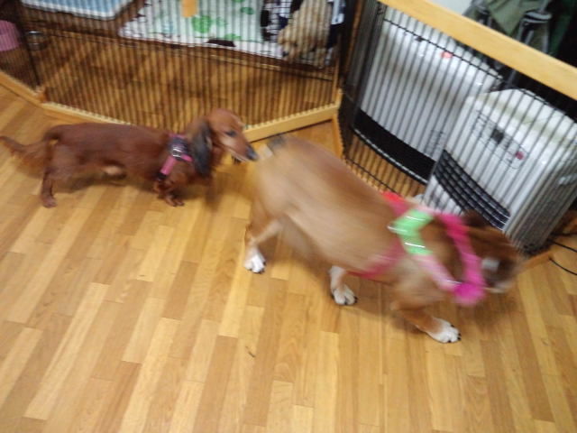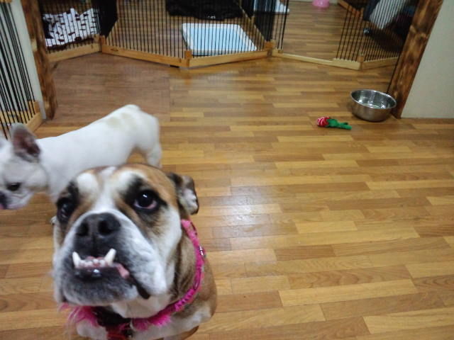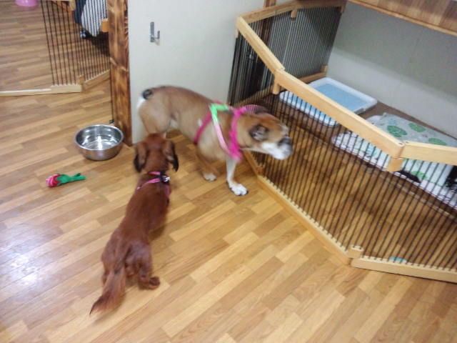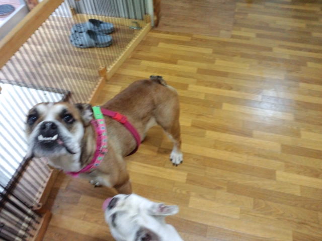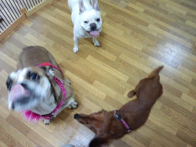 ブルドッグのヒメちゃんがチェックインしました。ダックスルシア君がヒメちゃんをお気に入りみたいです。