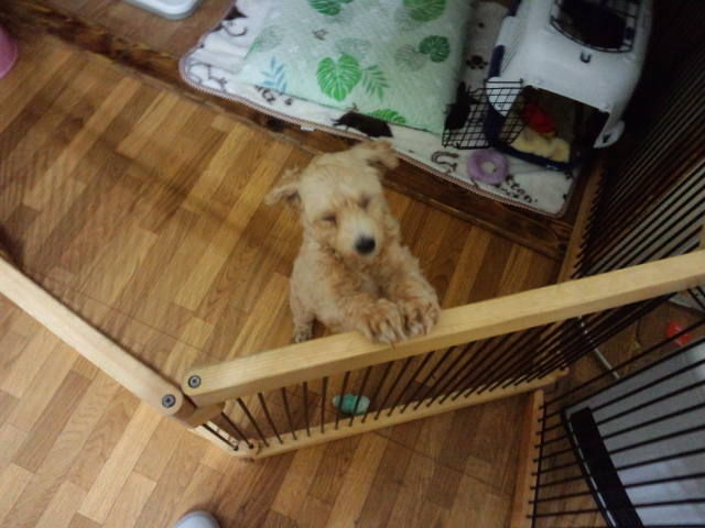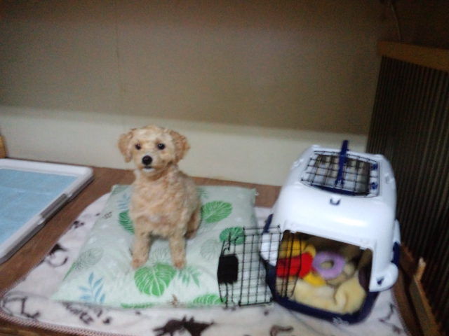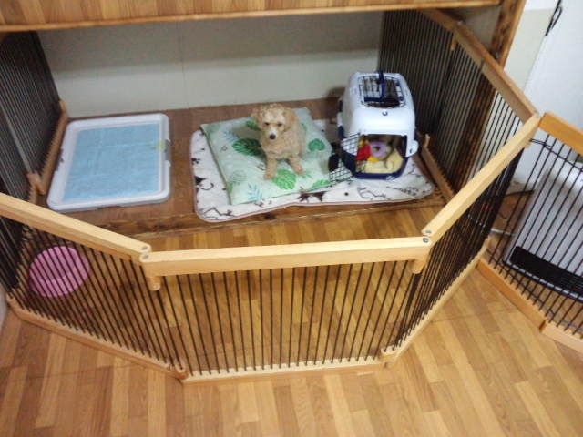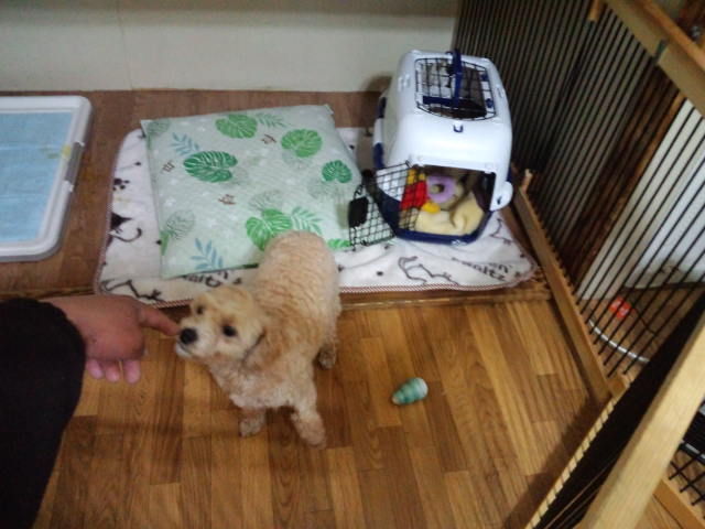 すももちゃんはまだパピーちゃん、お泊まりは初めてです。他のワンコとも?らしく、サークル越しに様子見です。