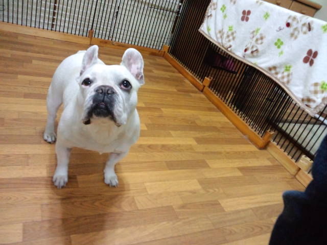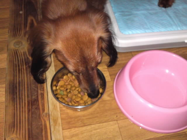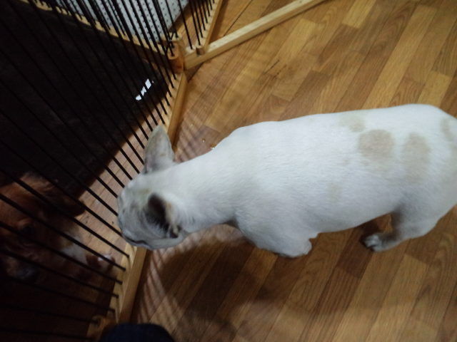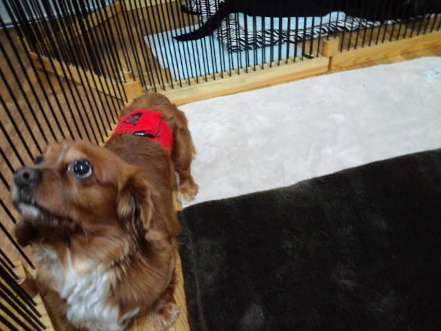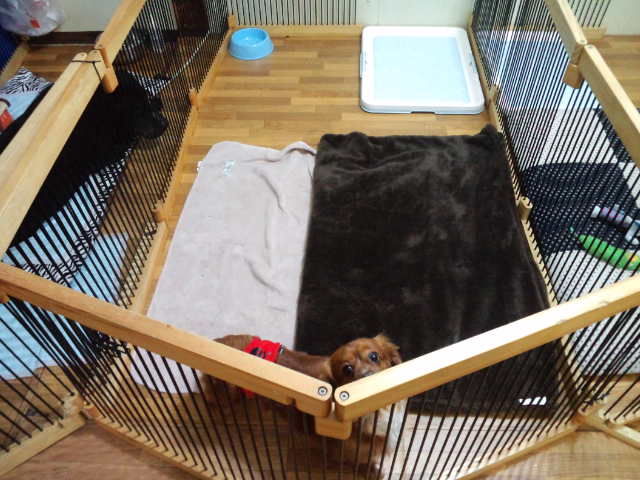 ダックスのルシア君がサークルから出てきました。パグのこまめちゃんとは少しずつ仲良しになれそうかな?