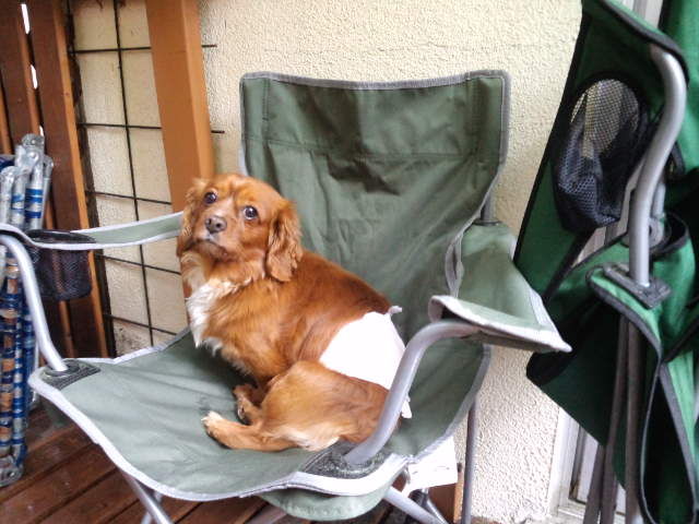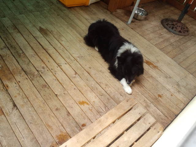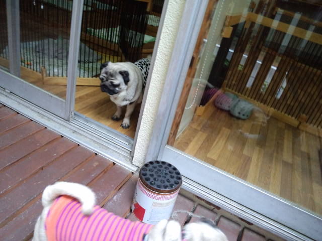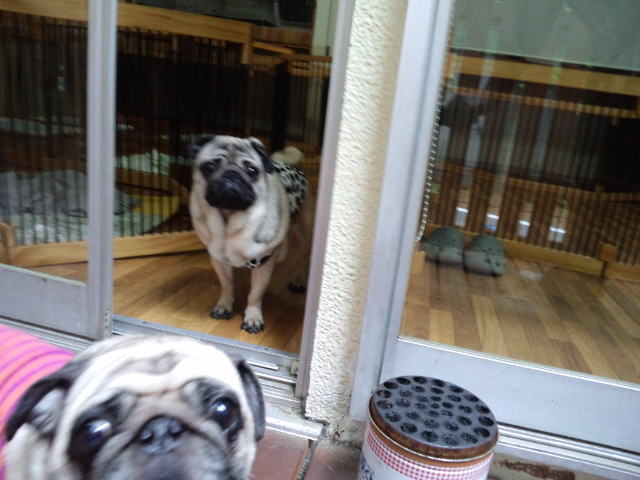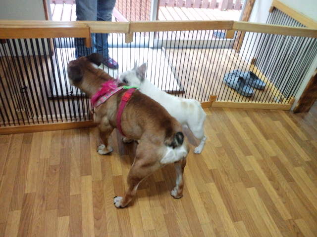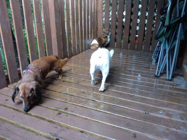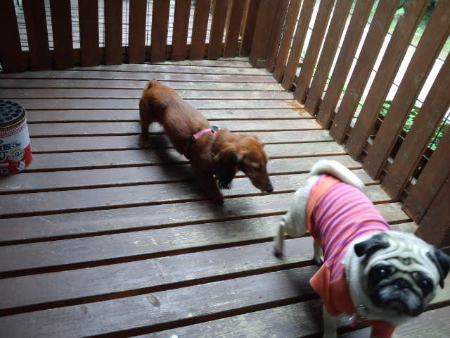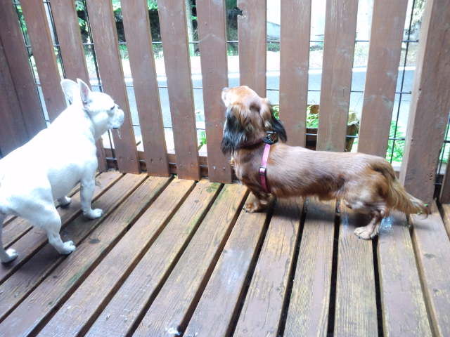 フレブルのマミちゃんとダックスのルシア君、デッキに出て走り回ってます。