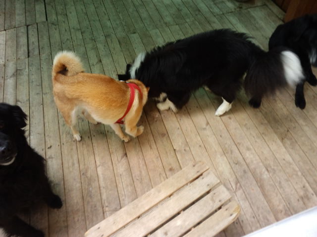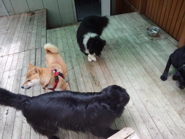 飼い主さんの去り際にヒュンヒュン鳴いてましたが、三匹居なくなったら入り乱れて遊んでます。