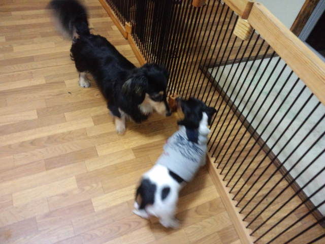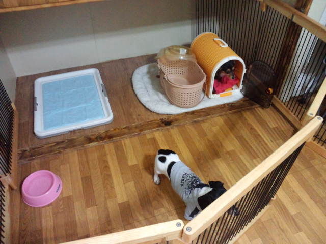 緊張しながらも他のワンコと遊ぶボン子ちゃん、バリケンにこもったペン子ちゃんです。