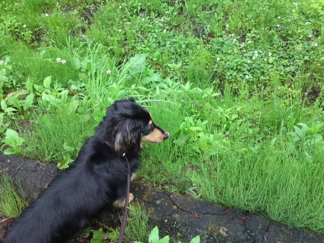 ダックスラブ君のオプション散歩です。 雨の合間を縫ってお散歩してきました。 元気に歩いてうん〇もしっかりしました。