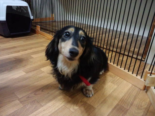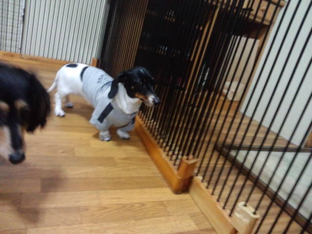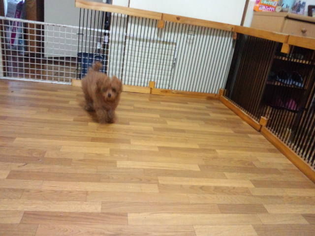 ダックスラブ君とトイプー愛ちゃん、サークルから出て遊んでます。
