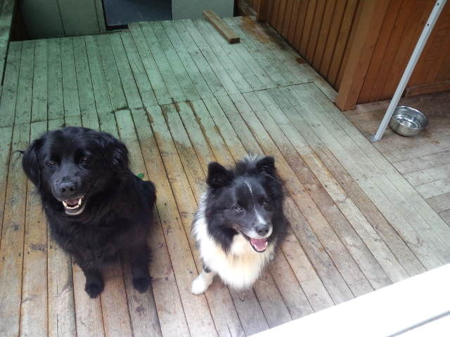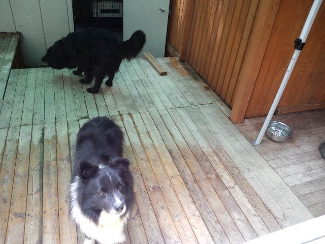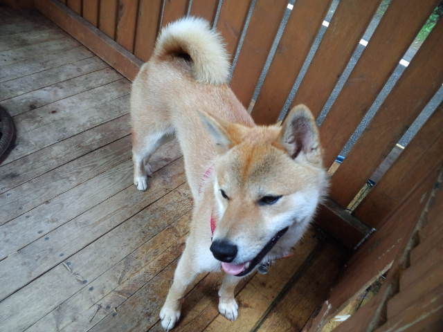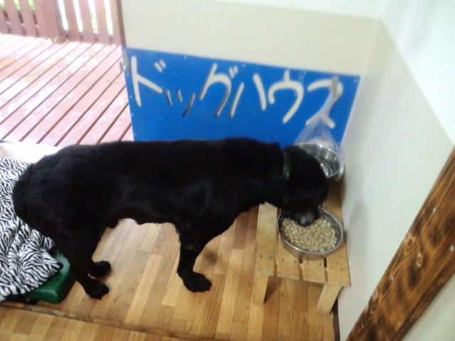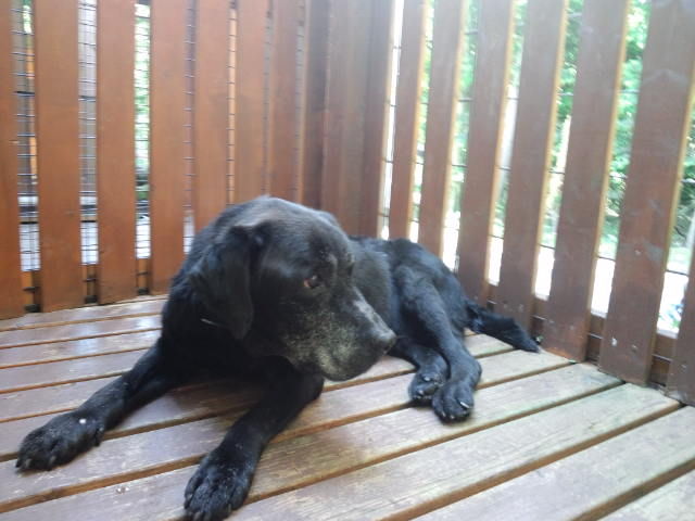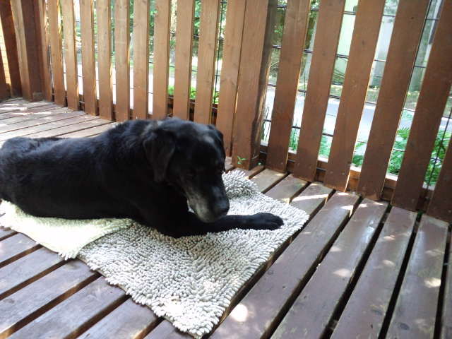 店内よりはデッキの方が風が通って涼しい。ブラッキー爺さんをデッキで涼ませてます。