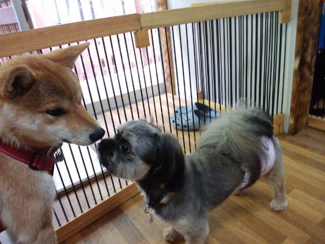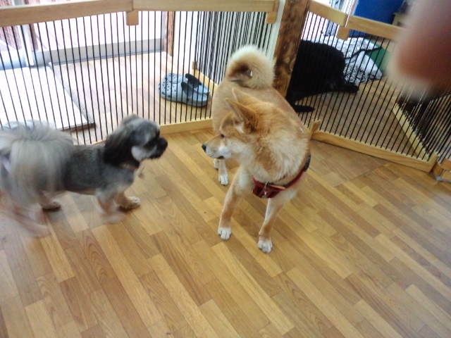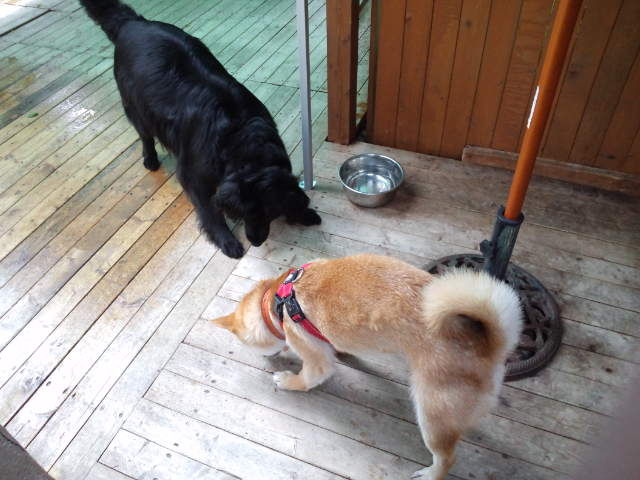 柴ハチ君に挨拶に行くダウ君、ハチ君が少し固まってます。ハチ君は大型犬には遠慮がないですが、小型犬には弱いんです。