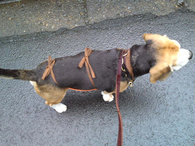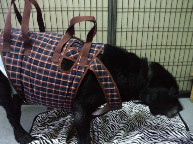 ラブラドールのブラッキー爺さんには、歩行補助用具を装着しました。これでブラッキー君も立ち上がるのに楽になるかな?