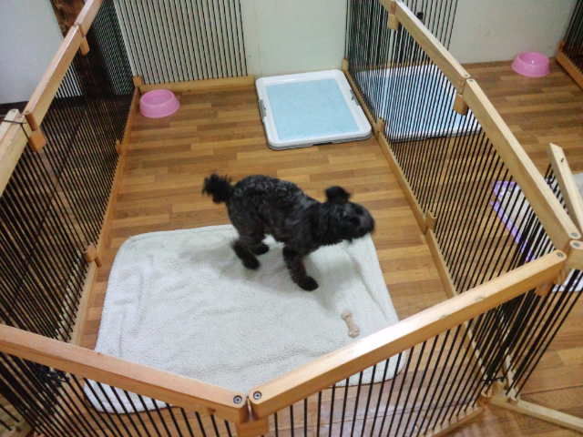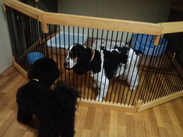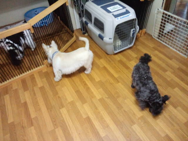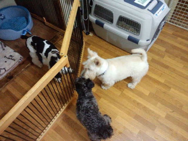 シュナウザーのうたちゃんがチェックインしました。 すぐにサークルから出て、スコッチテリア君と遊んでます。 サークル越しにコッカーちゃんともご挨拶してます。