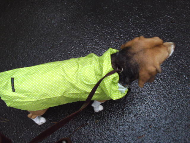 タラちゃんに続いてソンちゃんのお散歩は、ソンちゃんにとっては苦手でもライトグリーンの水玉模様のレインコートはとても可愛らしく似合っていました。