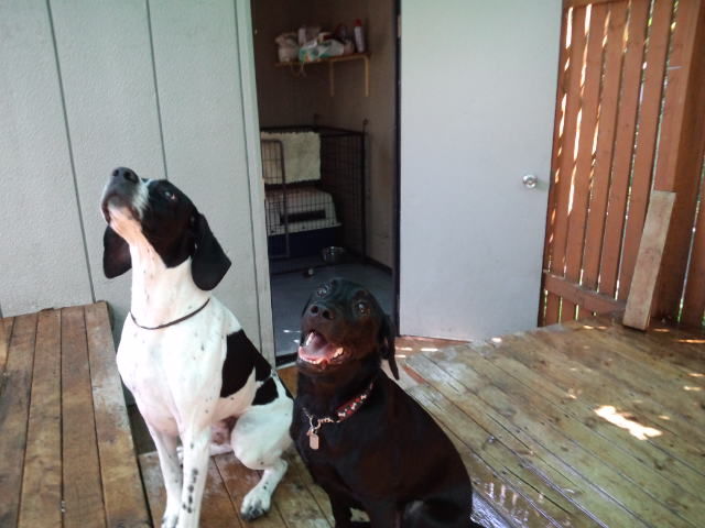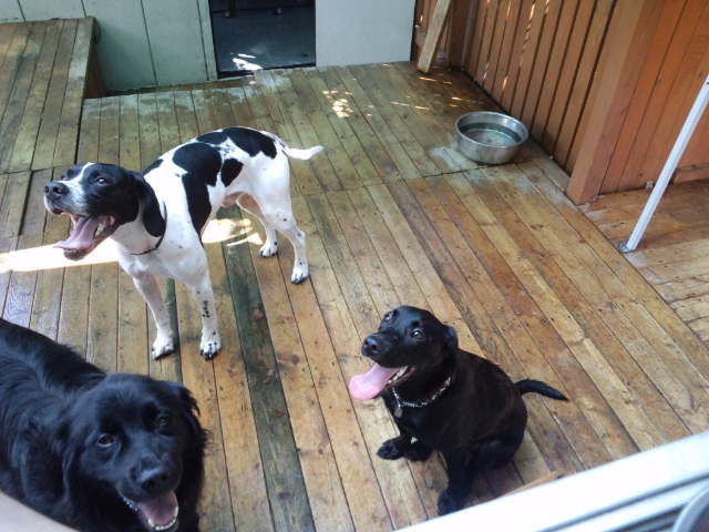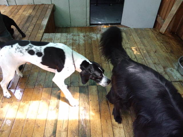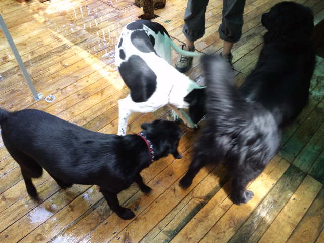 大型犬エリアにはポインターのもき平君が遊びに来ました。 ラブラドールの絵里ちゃんが大喜び、もき平君を追いかけて遊びに誘ってます。 もき平君は大治郎を追いかけ回し、三つ巴になってます。