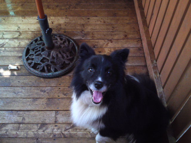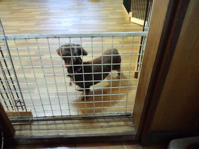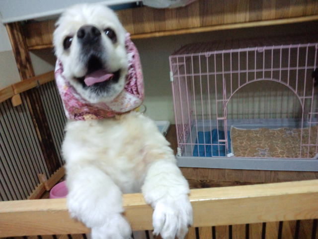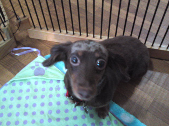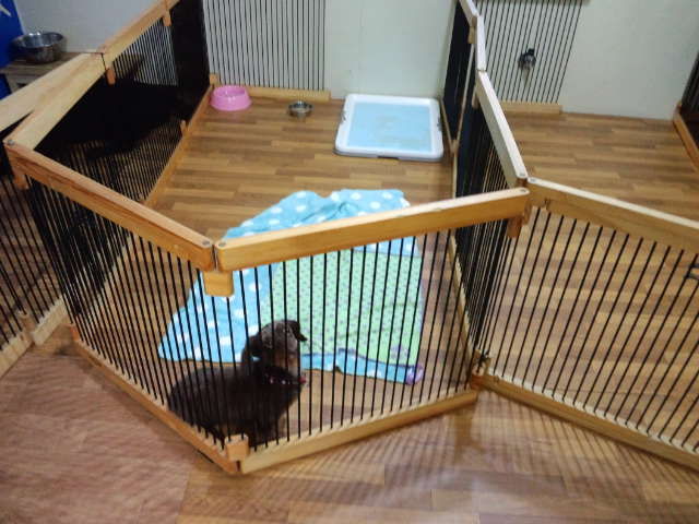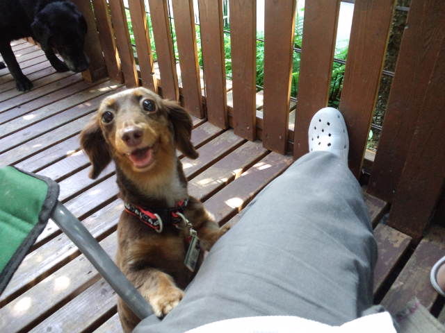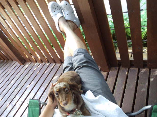 今日の小型犬エリアはカニヘンダックスのゆずちゃんのみ、店長部屋を覗いて寂しそうにしてます。 なので一緒にデッキに居ます。膝に乗って満足げなゆずちゃんでした。