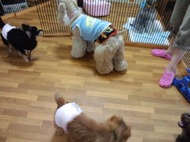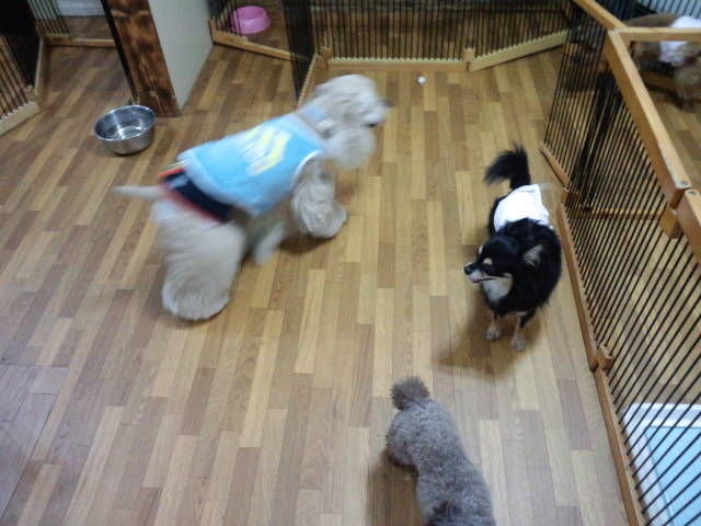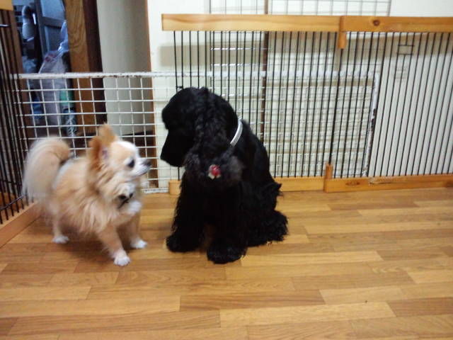 エス君はコッカーのはなちゃんとご挨拶してます。