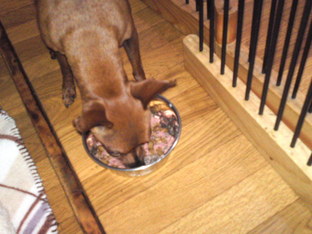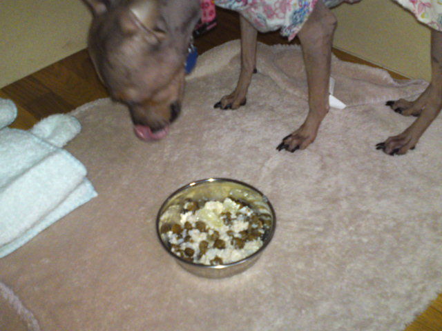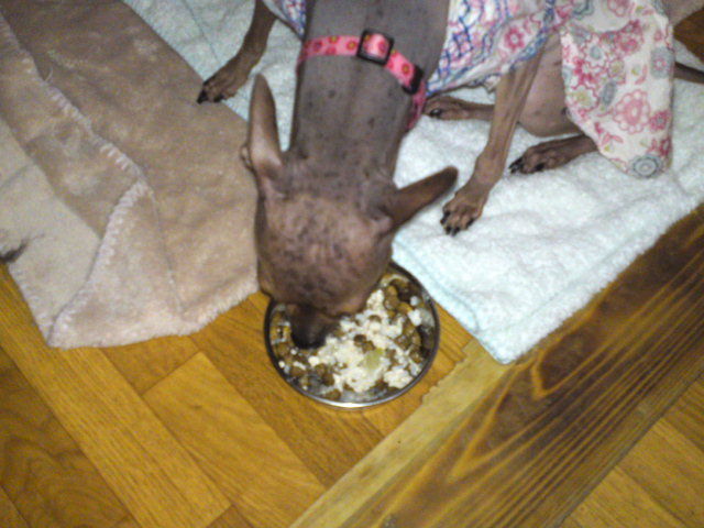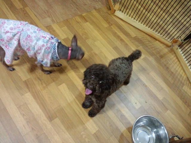 ミニピンのチェリーちゃん、少し口を付けただけです。ウンチは下痢気味です。 アメリカン・ヘアレスのキウイちゃん、夕べのご飯は完食してました。今朝は少し口を付けただけです。