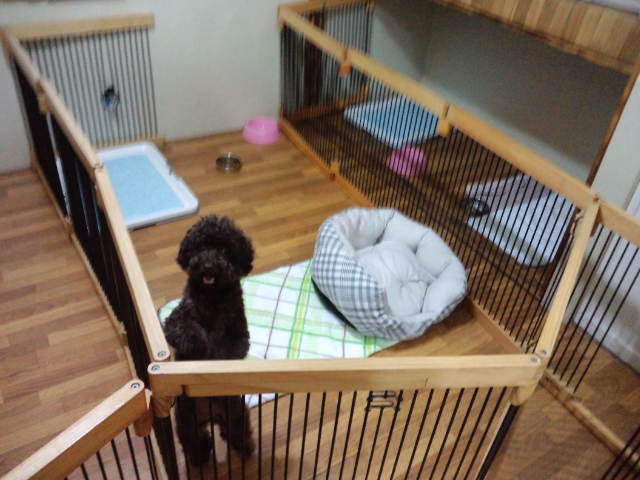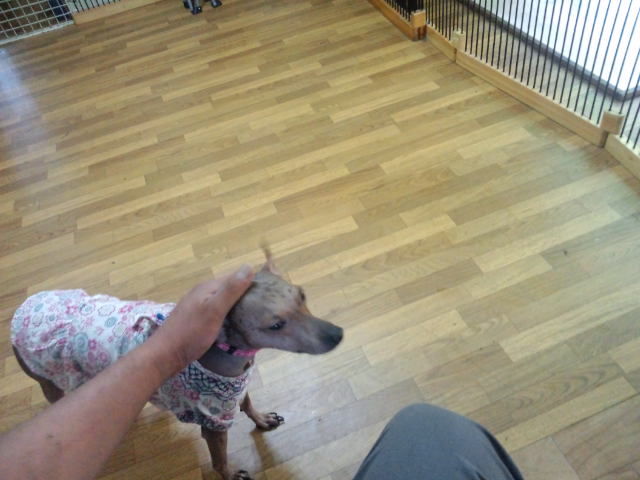 小型犬エリアではアメリカン・ヘアレスちゃんが寂しがってます。何故かと言うと、仲良しのミニピンちゃんがオプション散歩に出かけたからです。途中まで一緒に外にでたのですが、オプション散歩のミニピンちゃんはもっと遠くまで…。少し可哀想だったかな?