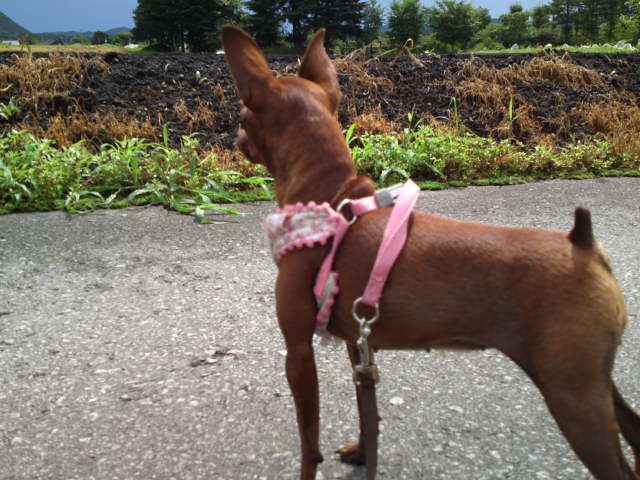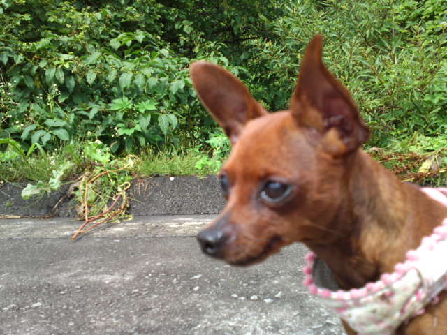 今日の軽井沢は小雨がぱらついては止んでの繰り返しで不安定な天気ですが、お散歩するには気持ちが良いのでチェリーちゃんも風の匂いや土の匂いをクンクンしながら歩いていました。