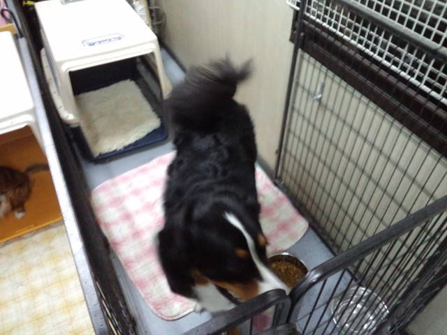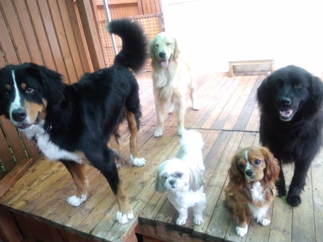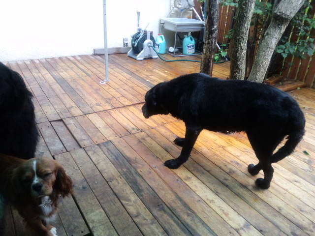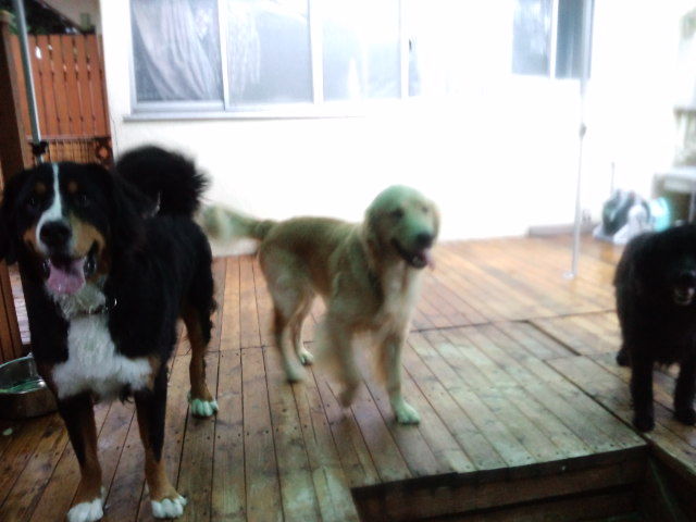 大型犬エリアではバーニーズ君とゴールデン君、シーズー君とキャバリア君が元気に遊び回ってます。 その横ではラブラドールのブラッキー爺さんが、一生懸命歩行訓練してます。大型犬エリアのデッキが一番動き易いみたいです。