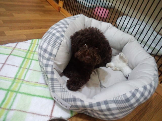 トイプーちゃんは元気が無くなってしまいました。クッションに寝そべったままです。