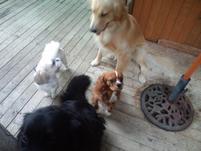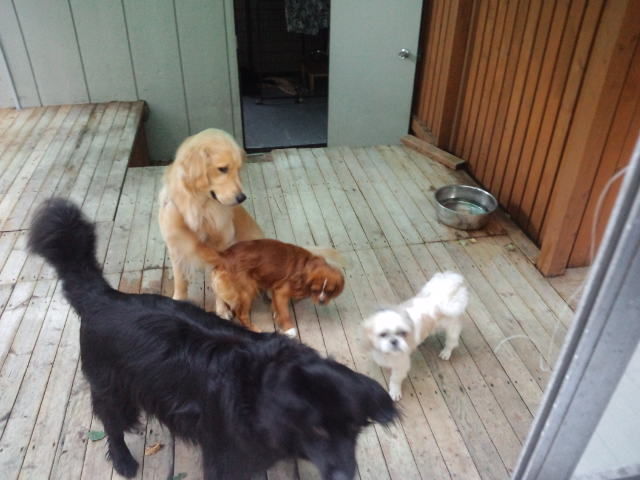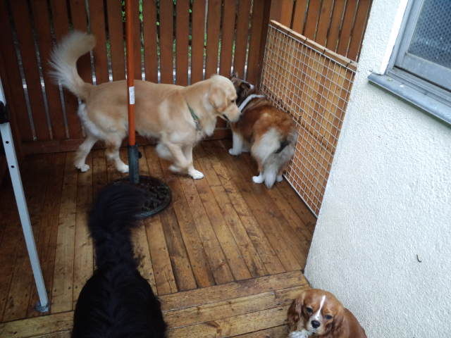 常連シーズーのラッキー君がチェックインしました。 キャバリア大吉とも顔馴染み、ゴールデンのジョジョ君とは初対面です。ジョジョ君が盛んに遊びに誘ってます。