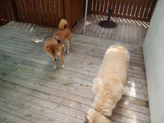 柴ハチ君と大治郎がうらやましそうな顔で見ています。