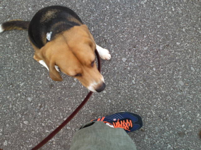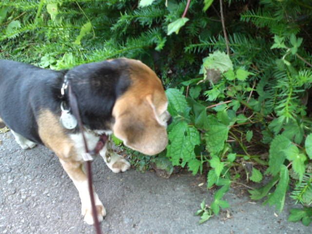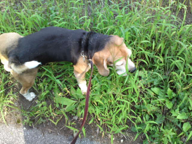 タラちゃん、待ちに待った夕方のお散歩は歩くことより匂いをキャッチすることで大忙しでした。