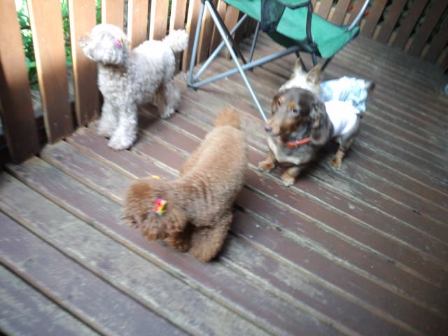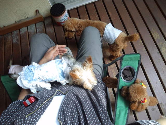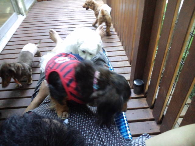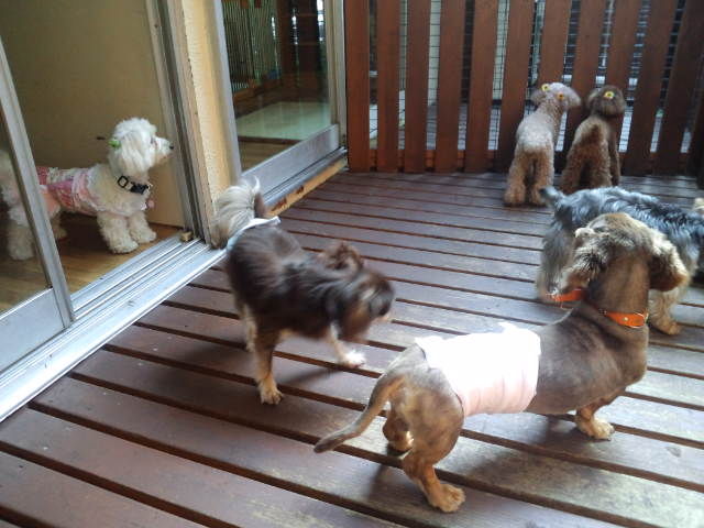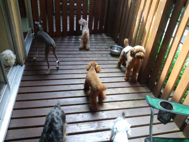 小型犬エリアではみんなサークルから出て、デッキや店内で遊んでます。
