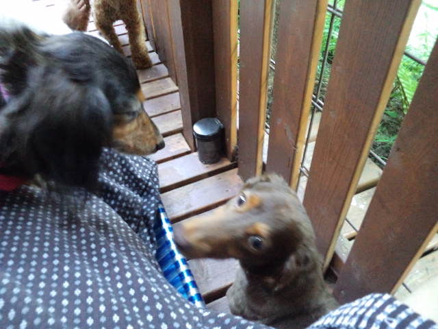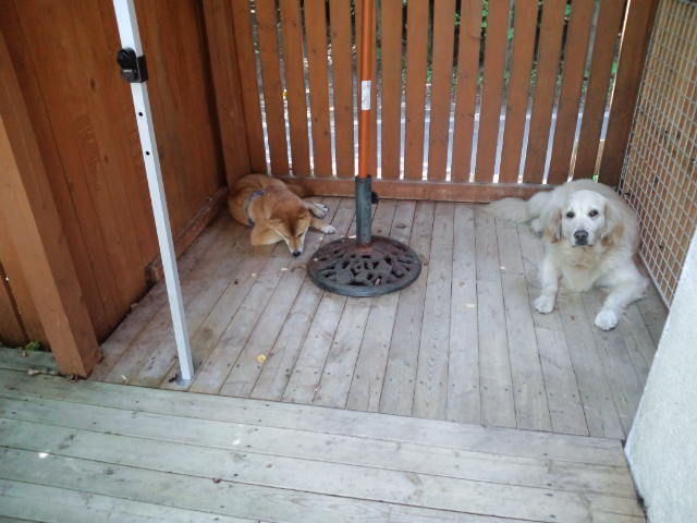 ゴールデンのサワちゃんと柴ハチ君、風の通る涼しい場所を心得ているみたいです。