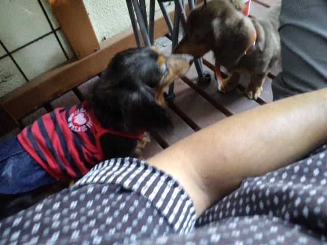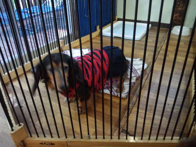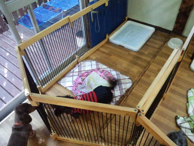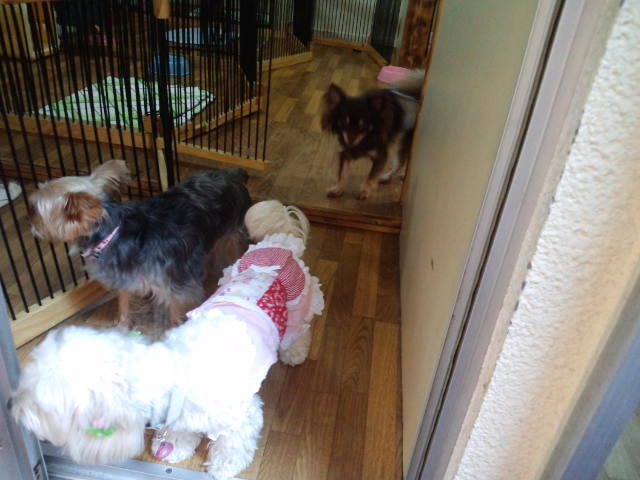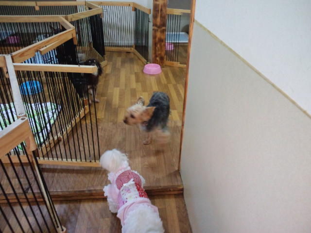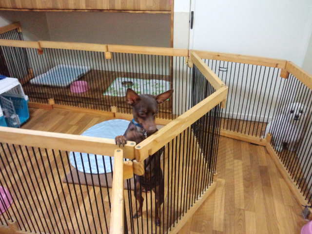 ミニピンチャチャ君、みんなが逃げ回ってもしつこくします。他のワンコがストレスになるのでサークルに入れてます。申し訳ありませんが、しばらくは一緒に出来ません。