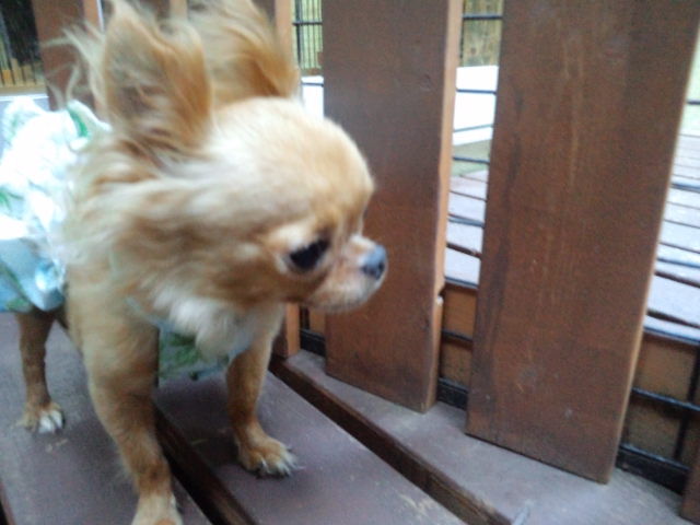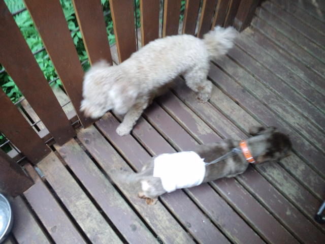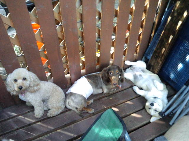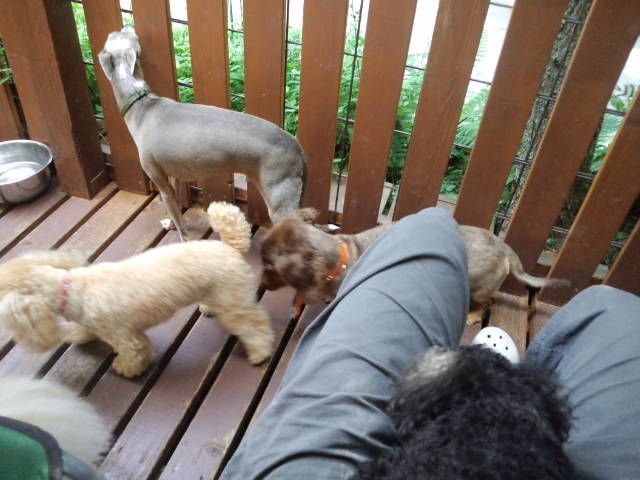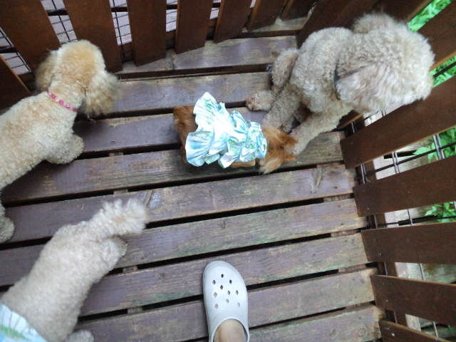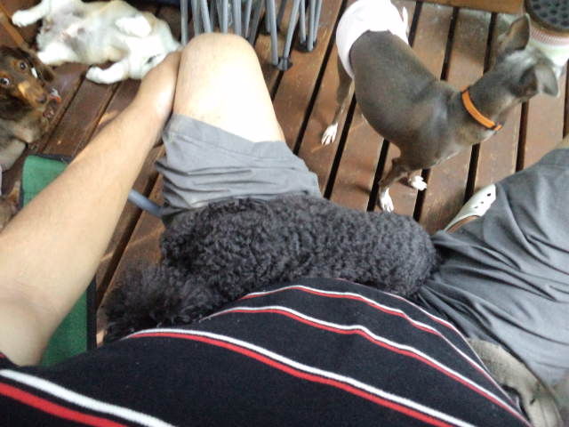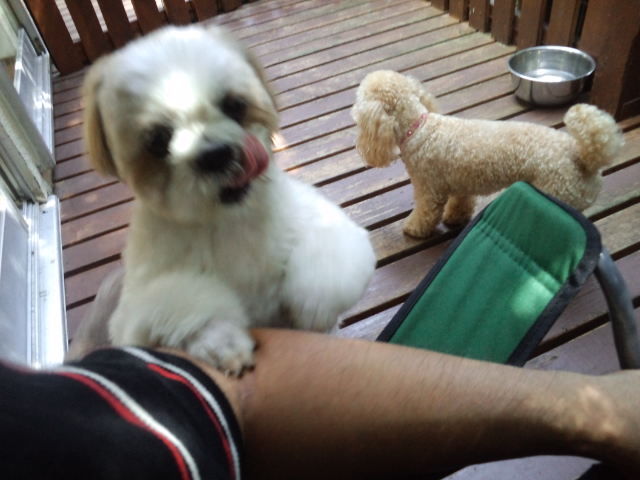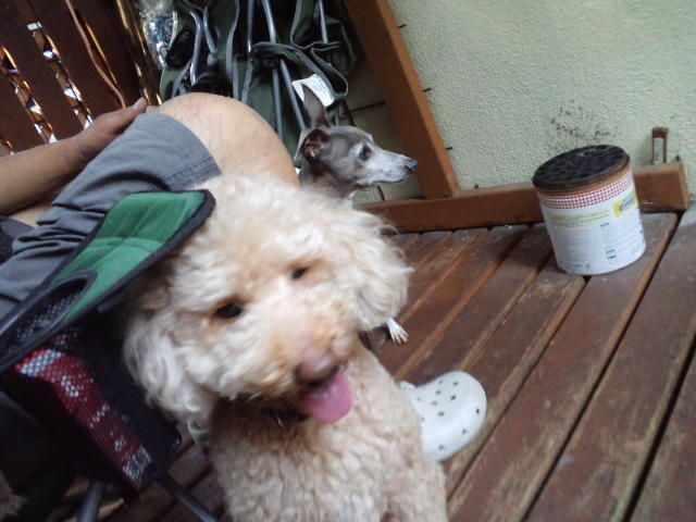 シーズー小太郎君は抱っこをせがんで来ますが、膝の上はトイプーハナちゃんに占領されてます。