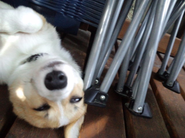 コーギーパピーのナナちゃん、デッキで昼寝してます。