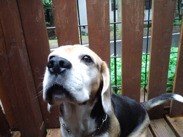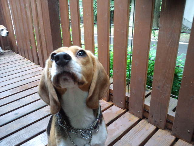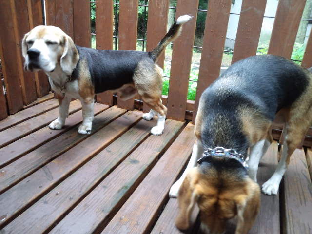お散歩代行のビーグルのタラ君とソンちゃん、今日はそのままホテルでお預かりです。とりあえずデッキで自由にさせています。