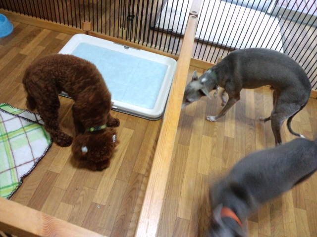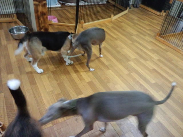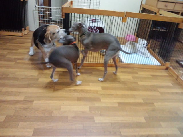 ビーグルのタラ君、イタグレ君達を見て尻尾をブンブンふってます。試しに近づけたら大喜びです。 お互いに匂いを嗅いでちゃんと挨拶もしまして、その後は大の仲良しになってます。今は興奮し過ぎるので分けてます。それにしても店長もびっくりする程の遊びっ振り、逆にソンちゃんの方が大人しくなっちゃいました。