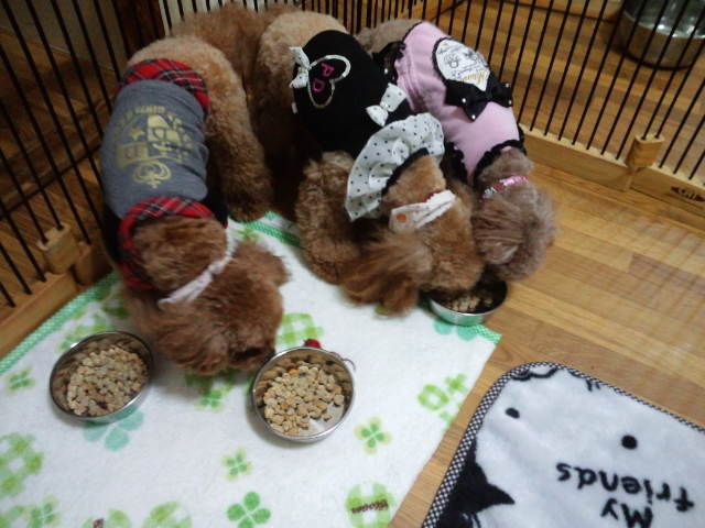 トイプーちゃんズのマロン君とショコラちゃんとラブちゃん、少し口を付けただけです。晩御飯は完食してました。