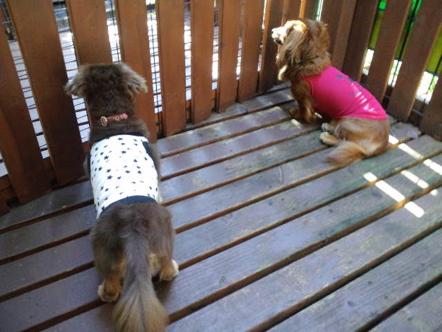 社交的な茶々丸君と少しマイペースなオーシャン君。二匹とも飼い主さんの後ろ姿を見ながら、少し黄昏てます。