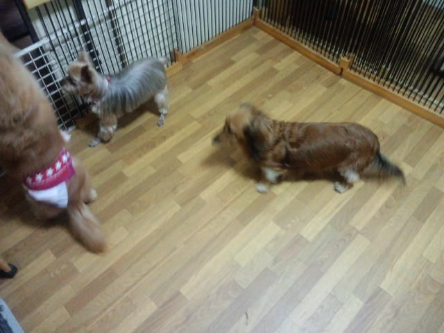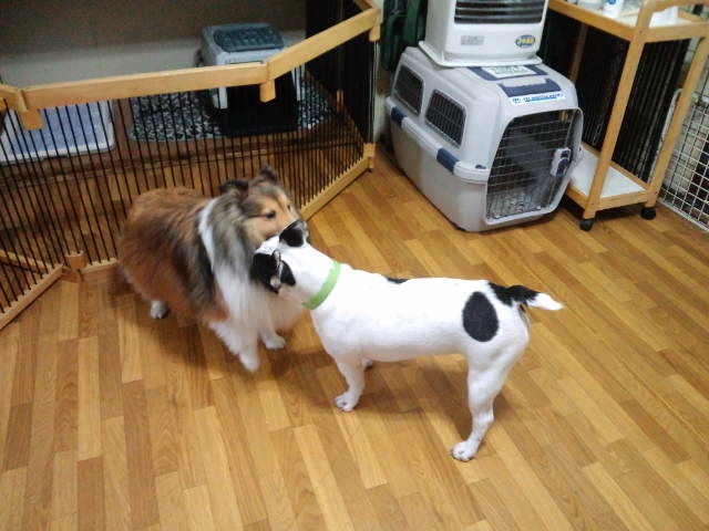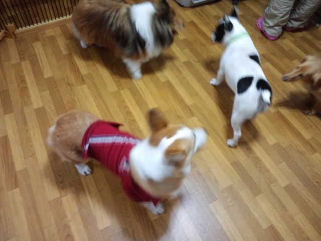 常連シェルティーのローズちゃんがチェックインしました。 フレブルジュリアちゃんが喜んで遊びに誘ってます。 コーギールーニー君も大喜びしてます。