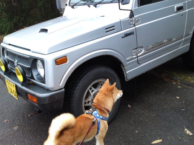 今朝は辺り切り一面キリに覆われています。ハチ君、店長ダディの車が気になるようで、しばらくの間匂いを嗅いでいました。