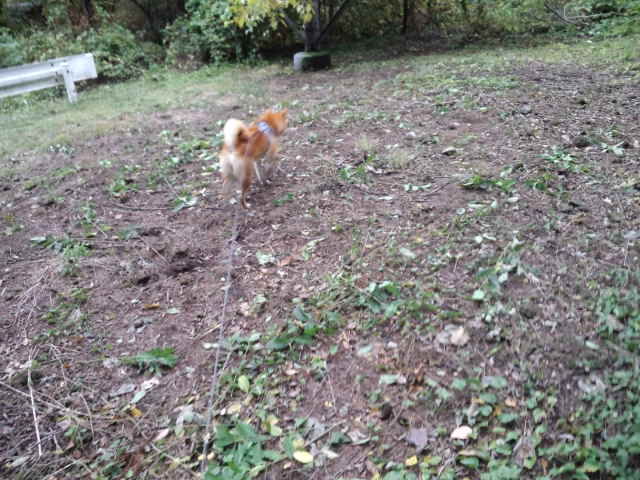 今年の紅葉は赤い色が鮮やかになりそうです。その中をグイグイ歩くハチ君です。