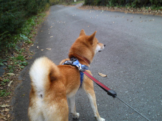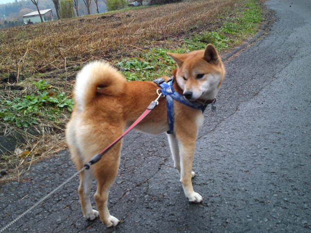 今朝は曇り風が冷たく感じます。ハチ君、畑で作業している人を立ち止まって見つめていました。