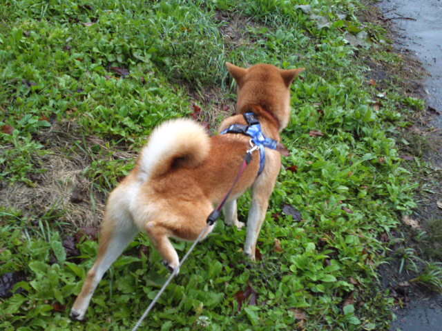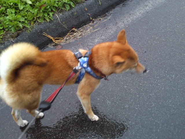 夕方のお散歩は雨が降っていますがハチ君は元気に雨の中のお散歩を楽しみました。