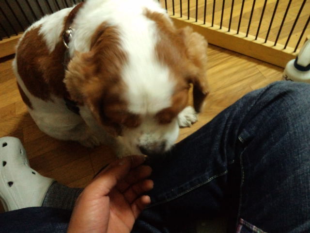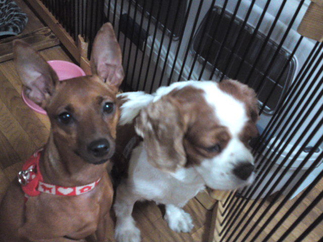 キャバリアのさくらちゃんはフレンドリー、ミニピンのチーズちゃんは少し神経質かな?さくらちゃんは甘えてきます。