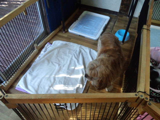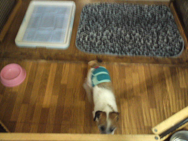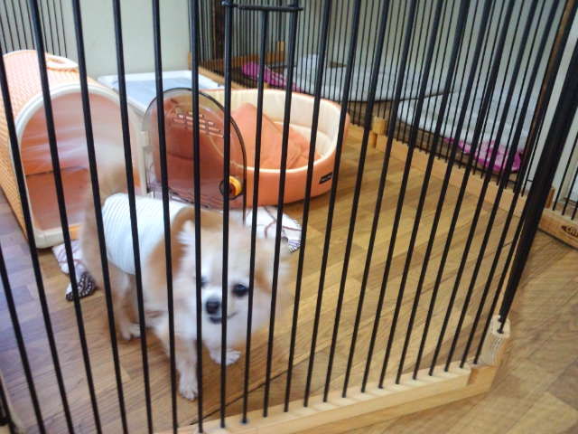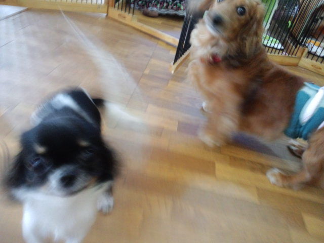 モモちゃんはすぐにサークルから出て、ダックス君ズに遊びを仕掛けてます。