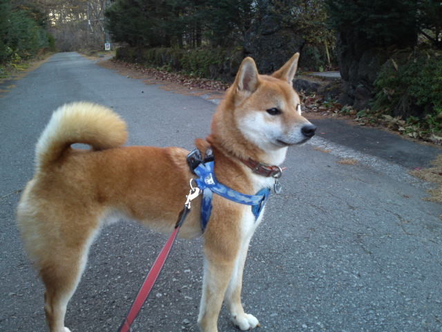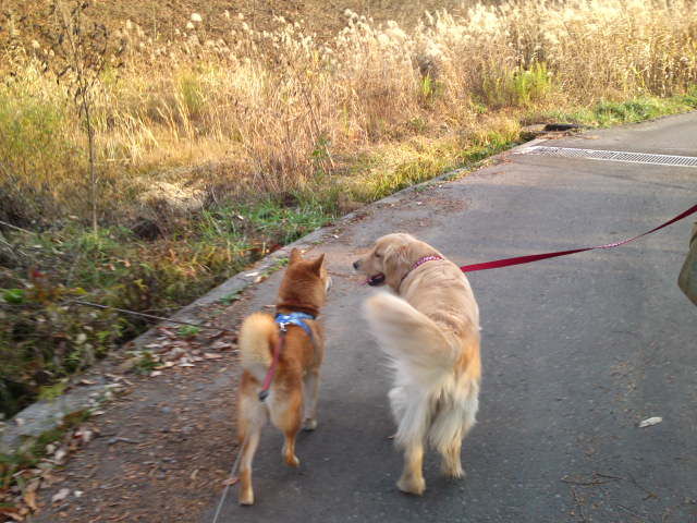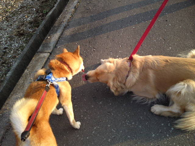 夕方のお散歩は暖かく歩きやすい陽気です。ハチ君、大好きなゴールデンのマロンちゃんと途中まで一緒にお散歩しました。