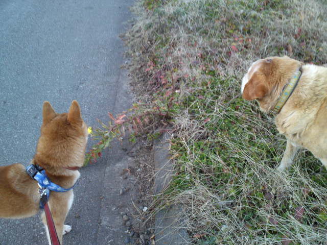 夕方になり更に冷え込んできました。ハチ君久しぶりにラブのレン君に会い挨拶していました。