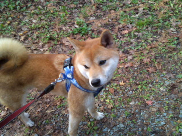 夕方のお散歩は暖かくて気持ちがよいです。ハチ君、今日も元気に歩いています。